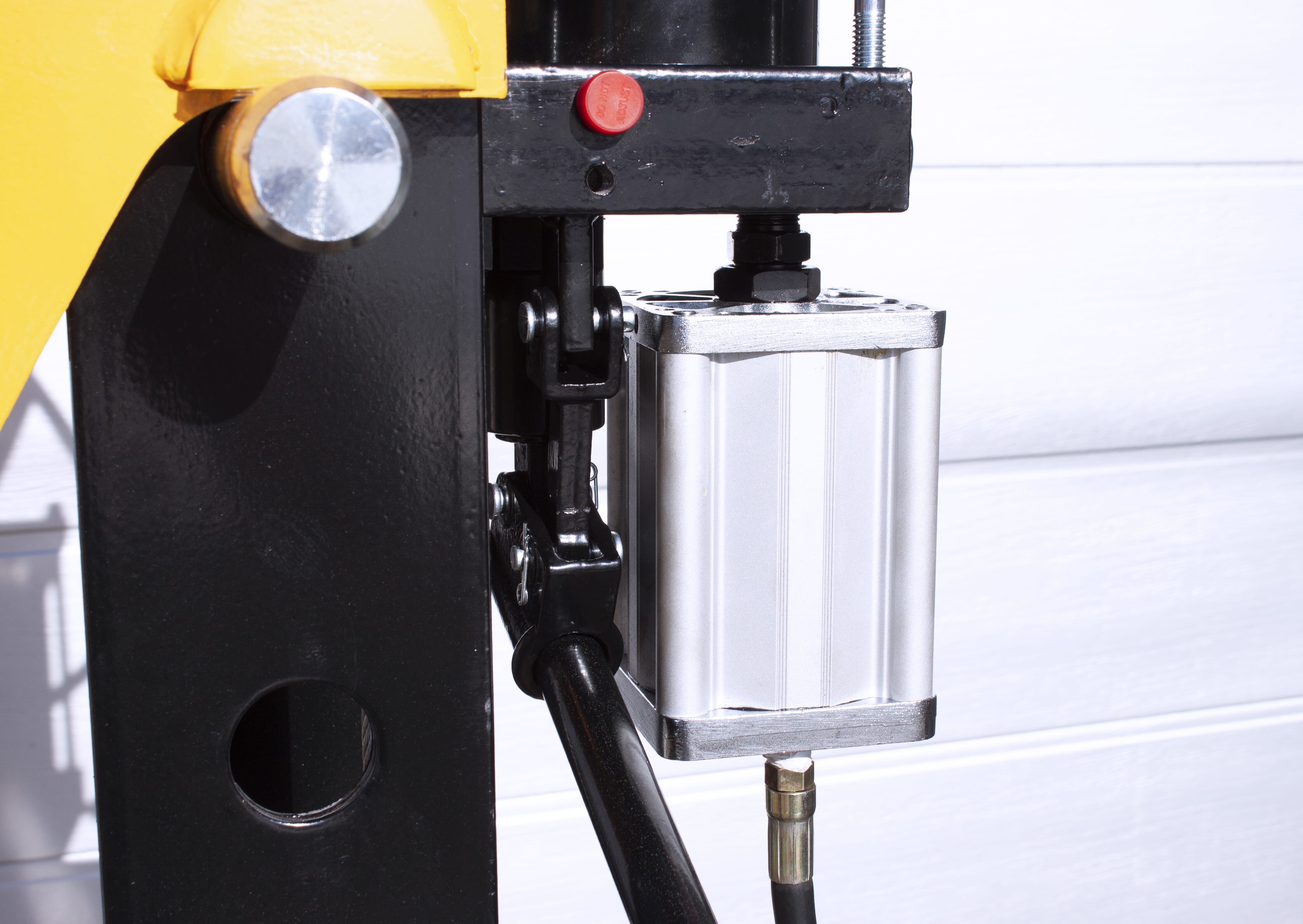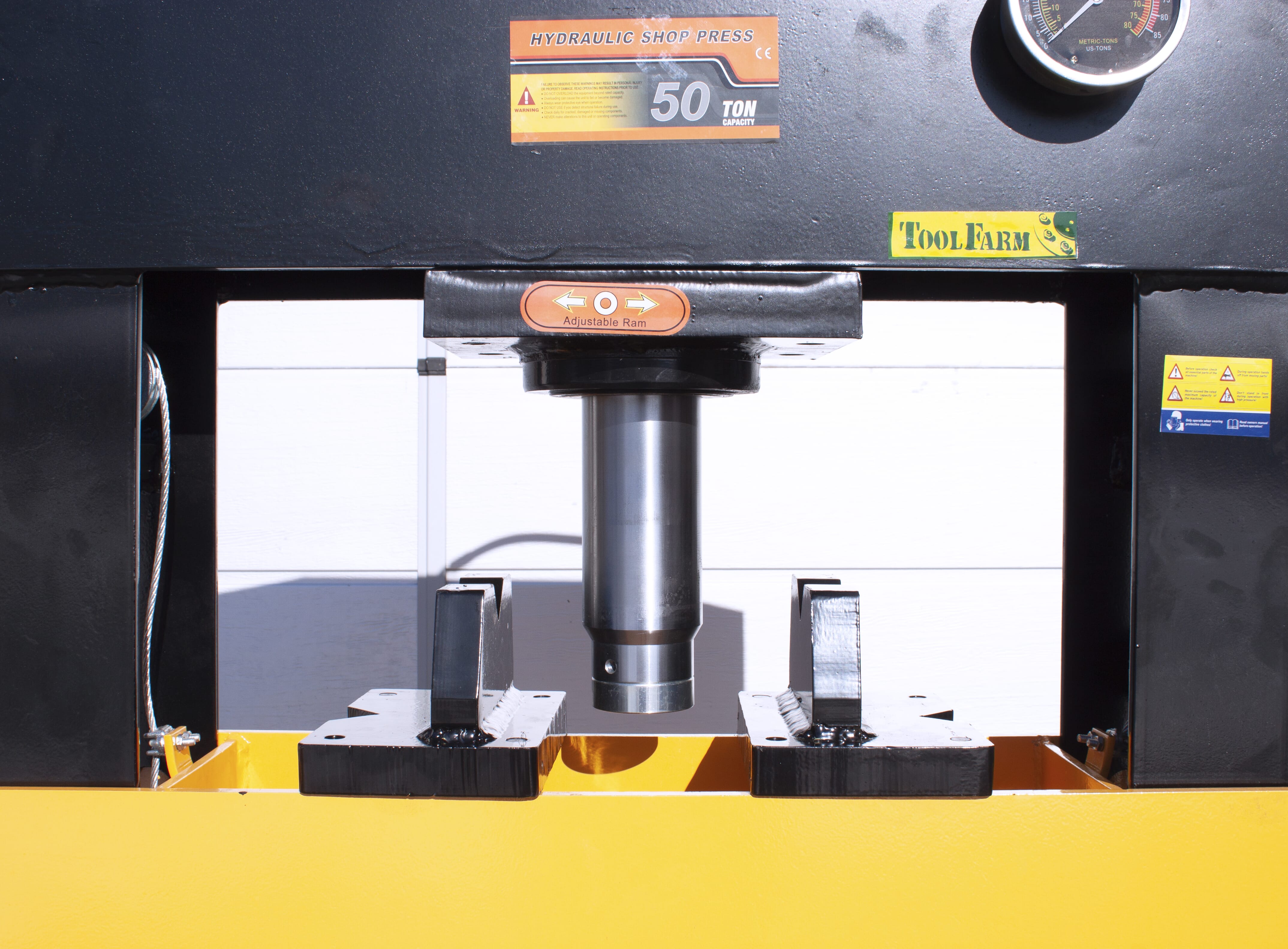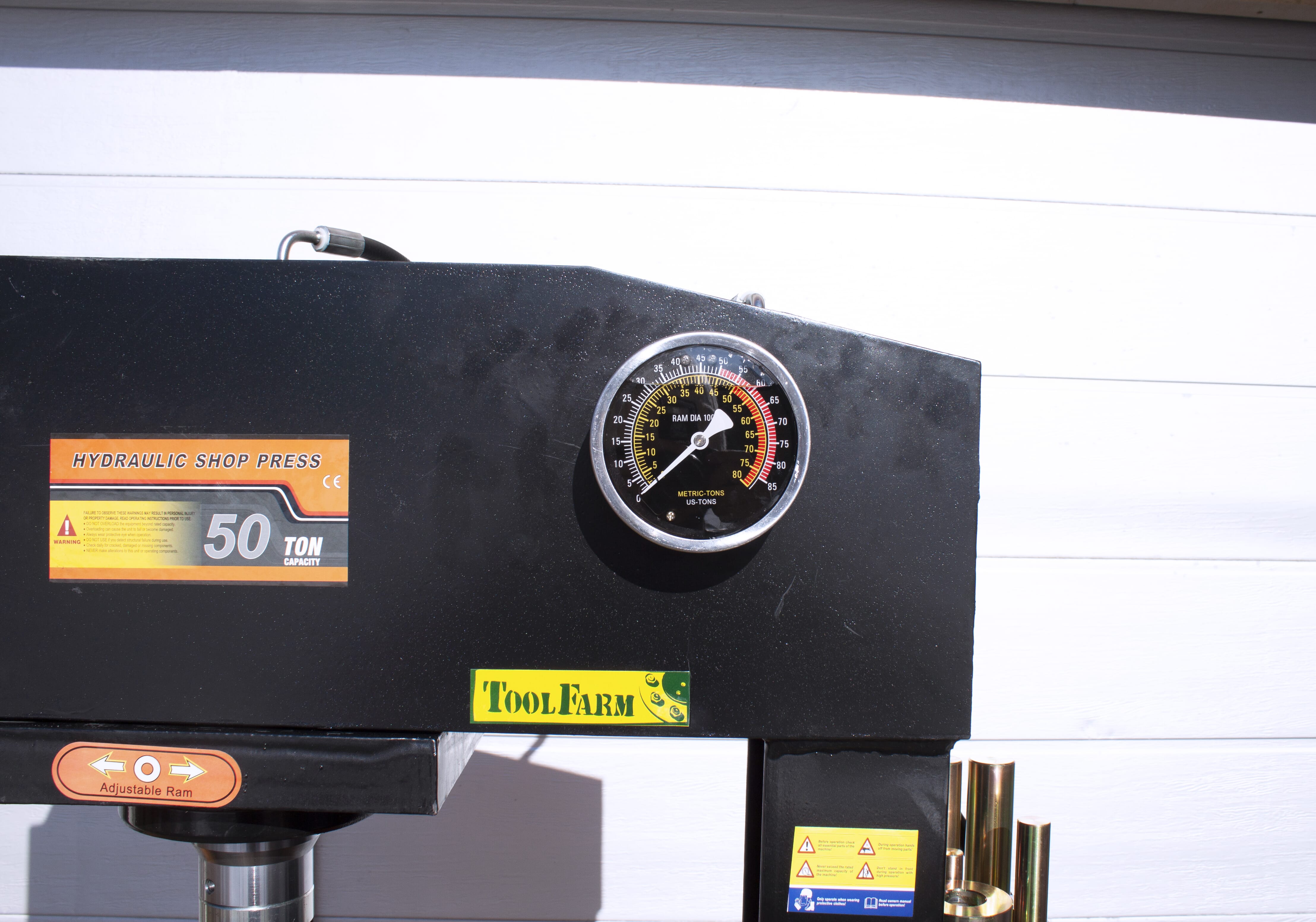Stor hydraulisk verkstadspress med hög kvalitet i alla delar, för dig som vill vara säker på att ha tillräcklig kraft tillgänglig. Kolven kan förflyttas i sidled. Förutom manuell pump kan pressen även drivas med tryckluft – fotpedal för luftventil medföljer. Fördelen med att den även kan drivas med tryckluft är att man kan hålla ett säkert avstånd under pressarbetet. Ett pressdornset ingår också.