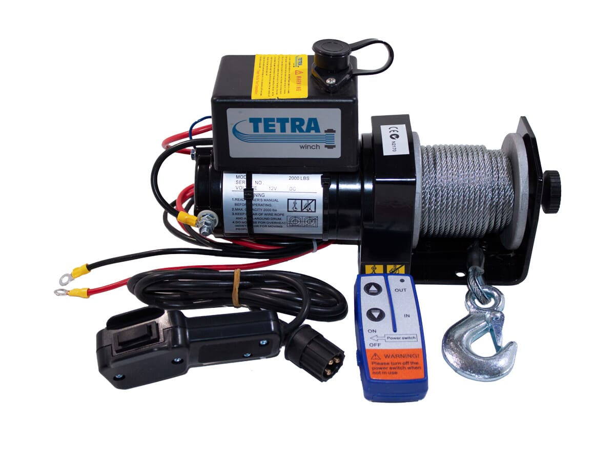 Här har vi tagit vår gamla modell (vi har sålt den sedan 2006) Tetra 2000 och utrustat den med trådlös styrning. Det innebär att du kan fjärrstyra vinsjen i båda riktningarna från upp till 40 meters avstånd. Allt du behöver medföljer: Styrbrytare, kablar, monteringsplatta och wirestyrning. Den har också friläggning av trommeln så att vajern snabbt kan dras ut för hand.